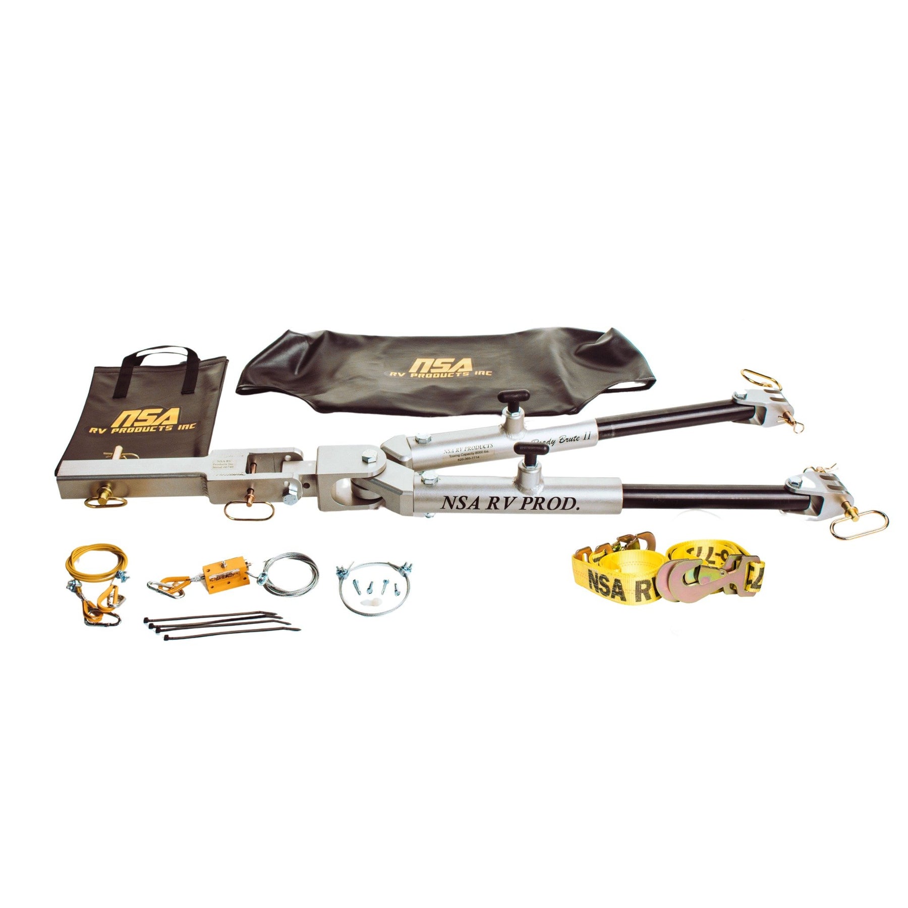 This Ready Brute Elite II complete RV tow package includes everything you need to tow behind your RV for $500 to $1500 less than the competition. We bundle all the vehicle-specific parts you'll need (Baseplate, light wiring) with our best-in-class aluminum tow bar. Our goal is to send you everything you need to tow a vehicle safely, legally, and easily for one low price. Just tell us what car you plan to tow in your order notes and our experts with put together all of the parts you'll need to tow. For over 25 years NSA has been making top-quality tow products in the USA. Our tow bars have every feature you'd expect in a premium tow bar (non-binding, telescoping arms, easy hookup and stow, and corrosion resistance).